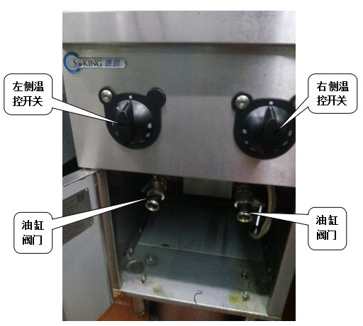 3、打開(kāi)炸爐電源右側(cè)指示燈亮,開(kāi)啟左側(cè)和右側(cè)的油缸控制開(kāi)關(guān)。將溫度選擇到待炸食品所需的溫度,將溫度旋鈕撥到一般220度處,油開(kāi)始升溫,在25分鐘左右后電炸鍋可準(zhǔn)備工作。