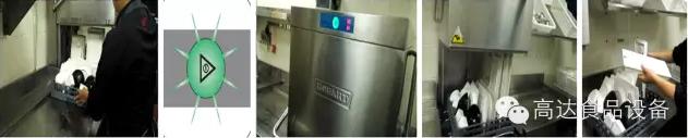2、擺筐:花灑預沖洗,必要時需清水浸泡,完成后再擺筐(浸泡注意:a、餐具不露出水面 b、水溫為50℃左右 c、加水量是水池容積的70%~80% d、浸泡時間為5~20分鐘)