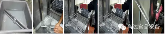 2、打開機門,取出碗筐架和過濾網(wǎng)板